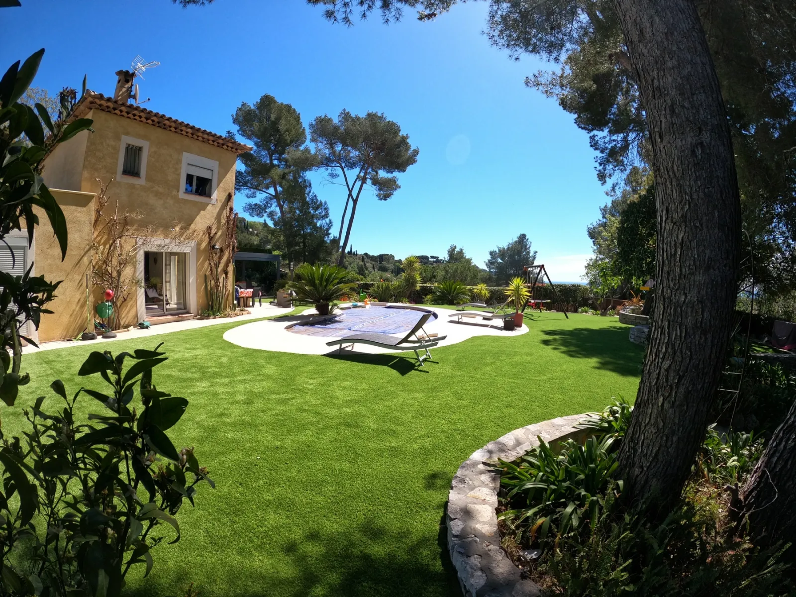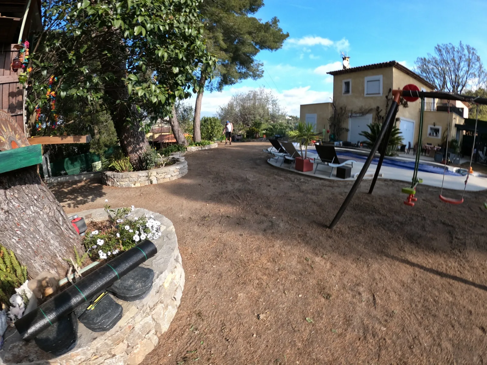 Dès l'arrivée sur place, le tableau était clair. Belle villa, tuiles canal, façade ocre. Un jardin que les propriétaires aimaient mais qui leur coûtait beaucoup de temps. Les murets en pierre sèche délimitaient des massifs chargés de cycas, d'agaves, de strelitzias, de yuccas et de palmiers. Entre tout ça, la pelouse naturelle ne suivait plus. Sol en légère pente, zones boueuses près de la piscine dès qu'on arrosait, mauvaises herbes qui repoussaient partout malgré les traitements. Les propriétaires nous ont dit quelque chose de simple : ils voulaient retrouver leur jardin, pas y passer leurs week-ends.