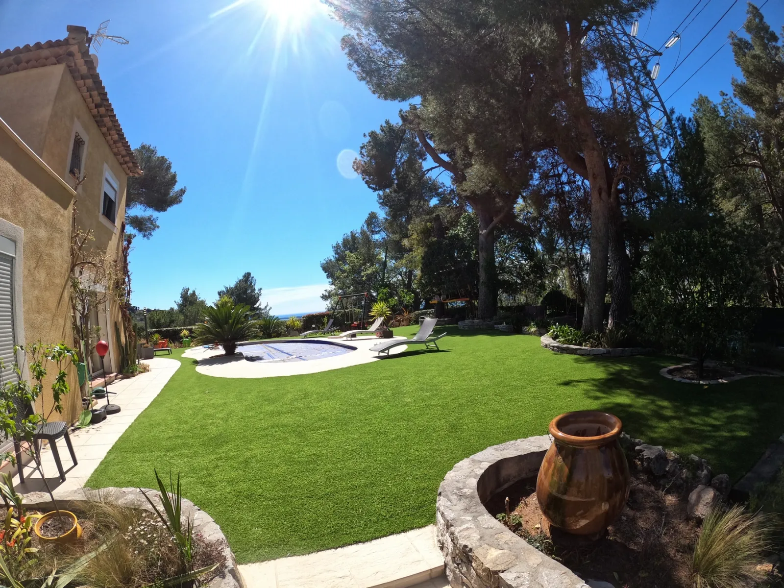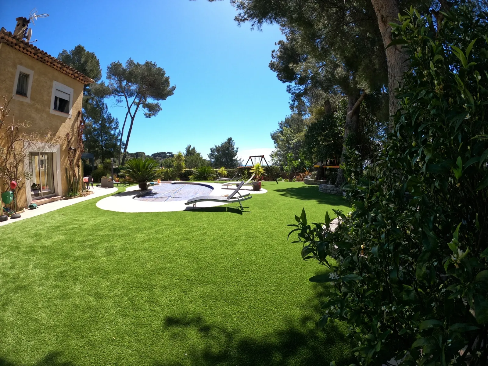 Plus de boue après la pluie. Plus de désherbage. Plus d'arrosage. Le gazon synthétique AZUR 40 mm s'est intégré dans ce jardin qui reste, lui, résolument méditerranéen. Les palmiers sont là, les agaves aussi, les murets en pierre aussi. Rien n'a changé dans l'esprit du lieu. Juste plus d'entretien. Découvrez d'autres réalisations de jardins et tours de piscine sur la Côte d'Azur.