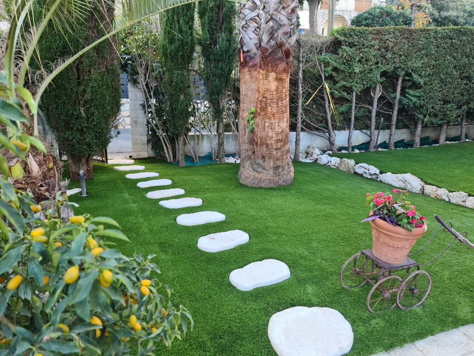 Notre client de Mandelieu la Napoule (06) est satisfait de la pose de notre gazon synthétique dans son jardin !